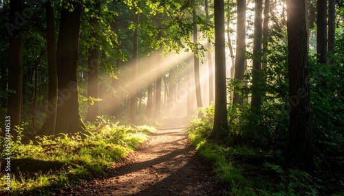 Sunbeams in a misty forest path