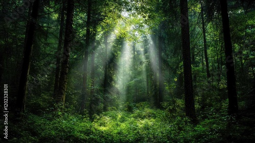 Sunbeams in lush forest, tranquil nature scene, ideal for relaxation and calmness
