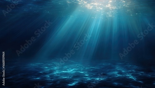 Sunbeams pierce deep ocean darkness, illuminating a textured seabed