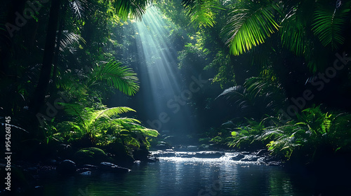 Sunbeams pierce through lush green jungle canopy illuminating a tranquil stream.