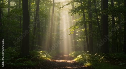 Sunbeams stream through lush forest. Ideal for web, design, marketing, or editorial use. Nature, mystery, and beauty converge.