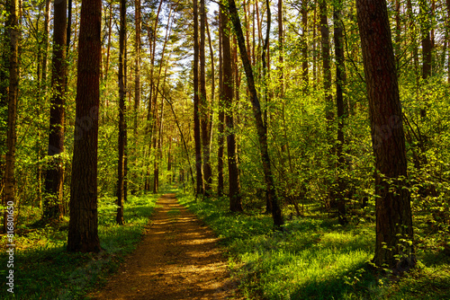 Sunbeams streaming through the pine trees and illuminating the young green foliage on the bushes in the pine forest in spring.