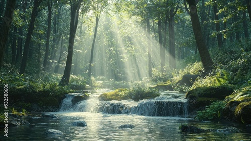 Sunbeams Through Forest Canopy Waterfall and River in Lush Green Foliage