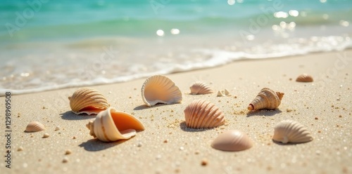 Sun-bleached shells scattered on pristine Indian Ocean beach sand , beauty, texture