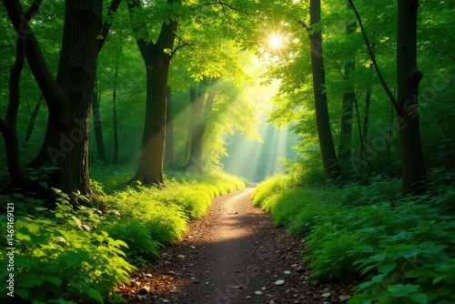 Sun-dappled forest path winding through lush green foliage, dappled sunlight on leaves , meander, sunbeams