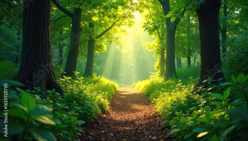 Sun-dappled forest path winds through lush greenery, sunlight filtering through leaves, creating a magical woodland scene Perfect for nature, travel, and fantasy themed projects , nature, light
