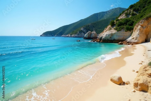 Sun-drenched beach, clear blue Mediterranean Sea, summer, travel, waves