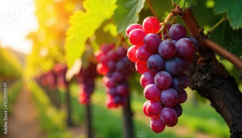 Sun-drenched bunches of ripe grapes hang heavy on the vine, ready for harvest The vibrant colors and abundant fruit showcase the bounty of the autumn season , field, crop