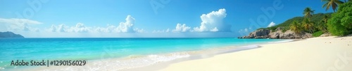 Sun-drenched empty beach, turquoise sea, flawless sky, serene, paradise, bright