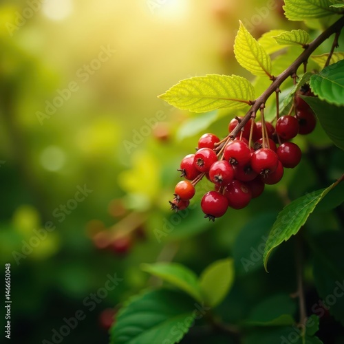 Sun-drenched wild berries, vibrant hues, lush foliage, blackberry, dew