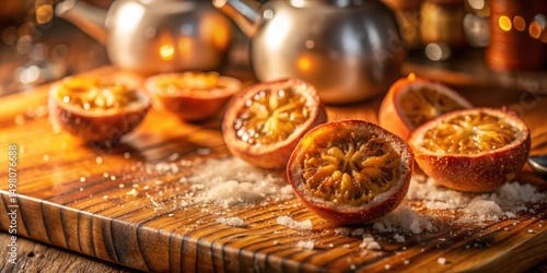 Sun-kissed Citrus Halves Glisten on a Wooden Board, Sprinkled with a Delicate Layer of Sugar, Ready for a Refreshing Culinary Experience