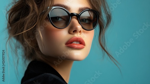Sunkissed elegance of a young woman with striking features and bold sunglasses in a chic studio setting