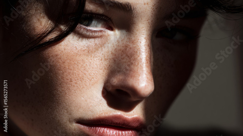 Sun-kissed portrait of young woman with expressive gaze. Beautiful use of light and shadow to evoke mood and depth