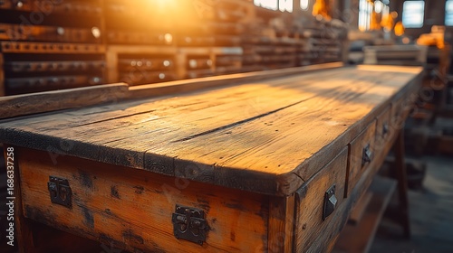 SunKissed Workbench Crafted Wood with Workshop Detail, Rustic Charm, and Golden Light.
