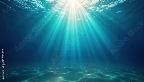 Sunlight beams through ocean water illuminating deep blue depths. Calm serene underwater scene shows tranquil nature. Beautiful aquatic landscape. Sunbeams create striking pattern on water surface.