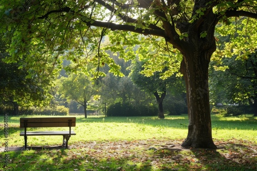 Sunlight Dappled Through the Trees, Empty Bench in a Park