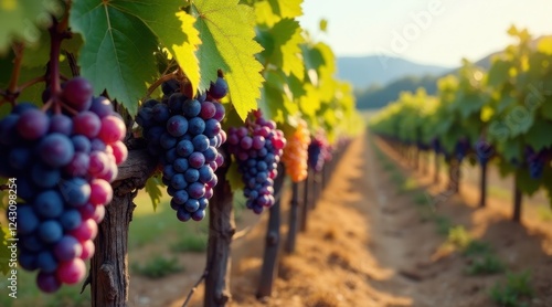 Sunlight Dappled Vineyard Rows with Ripe Clusters of Grapes Hanging Heavy on the Vines