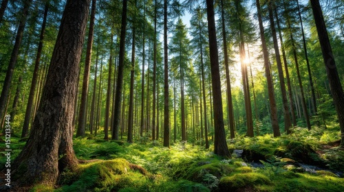 Sunlight filtering through dense forest canopy nature scene tranquil environment lush greenery landscape photography
