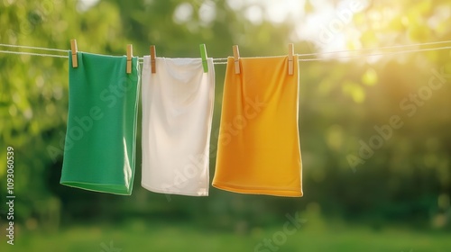 Sunlight filtering through laundry on a clothesline, gentle wind, peaceful morning scene