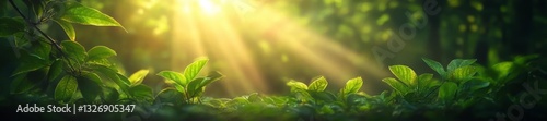 Sunlight Filtering Through Lush Green Forest Leaves. Generative AI