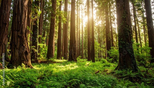 Sunlight filtering through redwood forest
