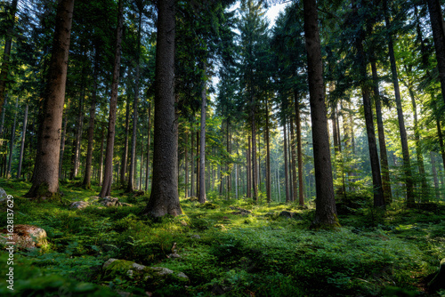 Sunlight filtering through tall trees in ancient forest