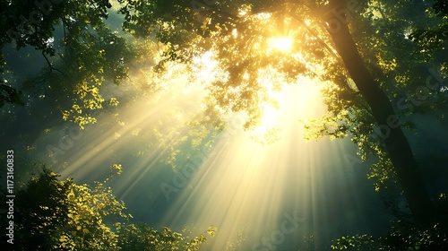 Sunlight filtering through trees in a serene forest setting.
