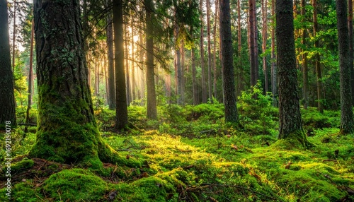 Sunlight filters through a beautiful green forest on a winding path, highlighting the autumn foliage