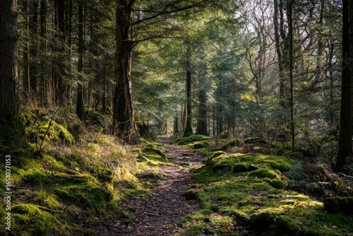 Sunlight filters through a mossy forest path