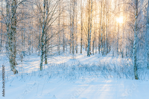 Sunlight filters through a tranquil snow-covered forest in Sweden, creating a serene winter landscape at dawn