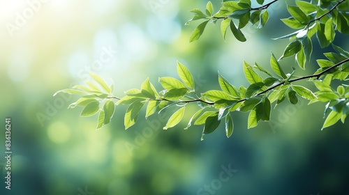 Sunlight filters through lush green leaves on a branch, creating a vibrant and peaceful nature scene.