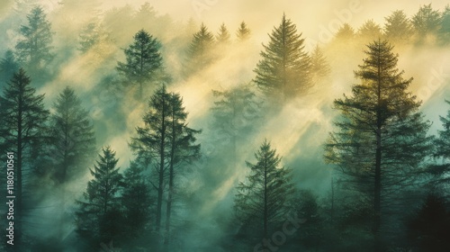 Sunlight filters through mist, casting ethereal beams between forest trees, creating a mystical, dream-like woodland scene.
