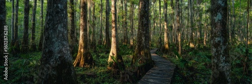Sunlight filters through tall cypress trees, illuminating a wooden boardwalk winding through a lush humid subtropical forest, creating a peaceful nature experience, Southeast