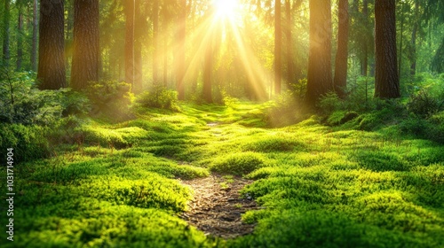 Sunlight filters through trees, illuminating a lush green forest path.