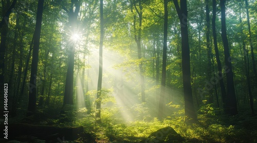 Sunlight filters through verdant forest canopy, creating ethereal light beams