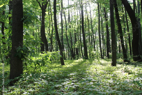 Sunlight in the green forest, spring time