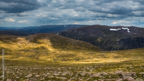 Sunlight piercing the clouds on a high plateau in the Cairngorms, Highlands, Scotland, UK