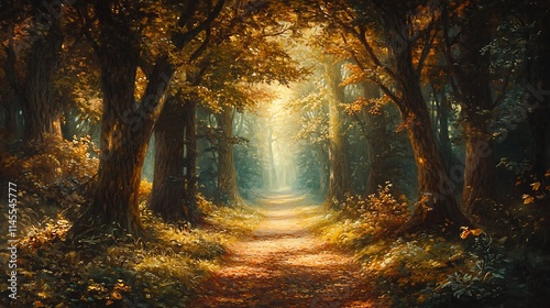 Sunlight pours through gaps in the thick canopy of a forest, illuminating a path covered with fallen leaves and surrounded by towering trees