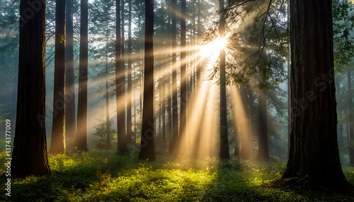 Sunlight Shining through Trees in a Peaceful Forest