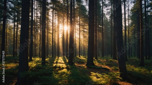 Sunlight Streaming Through Forest Trees Creating Warm Golden Light