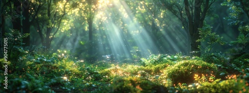 Sunlight streaming through the forest, casting rays on the misty path surrounded by green trees.
