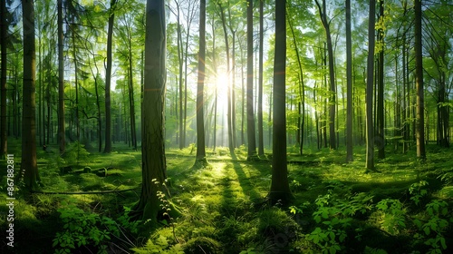 Sunlight streaming through the trees. The forest, the sun, the trees