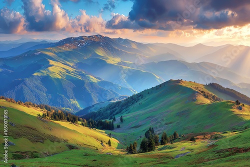 Sunlight streams across rolling green hills and majestic snow-capped mountains, creating a breathtaking vista of natural beauty and serene tranquility, evoking a sense of wonder.
