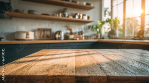 Sunlight streams into a modern kitchen with a wooden countertop, open shelves, and houseplants, creating a warm, inviting atmosphere