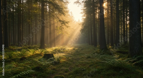 Sunlight streams through a dense coniferous forest, illuminating a path through the trees.