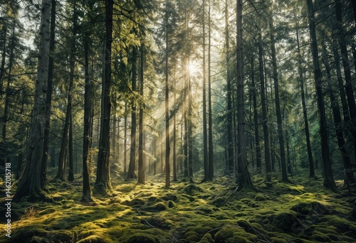 sunlight streams through a dense evergreen forest illuminating a vibrant green mossy floor.