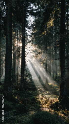 Sunlight streams through a dense forest, creating a magical ambiance.