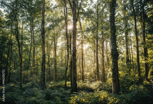 sunlight streams through a dense, verdant forest of tall trees, illuminating a lush undergrowth of ferns and wildflowers.