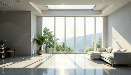 Sunlight streams through a large skylight, illuminating a bright interior , white, clear, clean