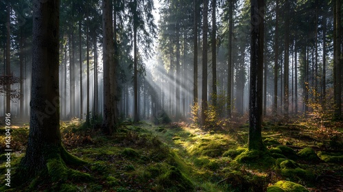 Sunlight streams through a misty forest.